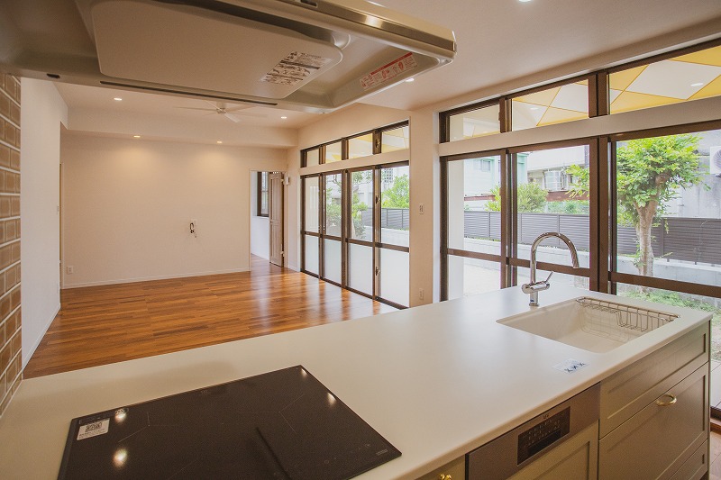 空きフロアを快適に暮らせる住まいにしたいと家づくりが始まりました。間仕切られていた2部屋の壁を取り払い、窓の開口を広げて、明るく風通しのいいLDに。さらにウッドデッキをつなげることにより開放的になり、素敵な庭を楽しめる住まいになりました。