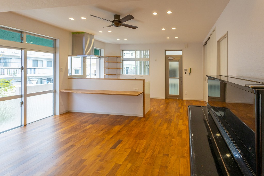 ご実家の築40年余りの建物の2階にリノベーションして住まわれることになったご家族。床面積21坪とコンパクトながらも、LDKとベランダのつながりを確保したり寝室をオープンにすることで窮屈さを感じさせない空間になりました。WIC、脱衣所、物干しスペースとサービス動線をひとまとめにすることで、家事の効率化も図れます。 また、建物の他におばあさまの思い出のピアノをお孫さんが引き継ぐことになり、家の中心にあるピアノから、毎日奏でる音色と共に過ごす時間をご家族は楽しみにしています。